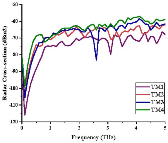 Although the tailored metamaterial designs manifest excellent S21 results, the RCS reduction values, however, were able to reach −60 dBm2 only, as illustrated in Figure 6. In these contacts, the coding metamaterial designs manifested better reduction values in the terahertz frequency range, which support the theory that the coding metamaterial are able to manipulate electromagnetic wave and realize different functionalities. Furthermore, TM4 has the lowest RCS reduction compared to other designs. Moreover, the RCS reduction values are inversely proportional to the dimension of the tailored structure. In other words, the RCS values were decreased when the size of the structure increased.