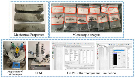 Figure 1 shows the preparation and testing stages of the mechanical property and microscopic tests. The compressive strength and the flexural strength of the cement mortar were tested according to GB/T 17671-1999 [21]. The tested ages were 1 d, 3 d, 7 d, 28 d, 60 d, and 90 d. The XRD test used a Shimadzu XRD-6100 X-ray powder diffractometer. The 2θ scanning range was 5°~90°, and the scanning rate was 10°/min. The SEM test adopted a Hitachi S-4800 field emission scanning electron microscope with a resolution of 1 nm (1280 × 960). In order to obtain good conductivity, all samples were sprayed with gold before the test. The pore structure of the cement mortar was determined by an Autopore 9620 high-performance automatic mercury porosimeter.