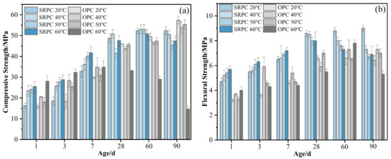 - High-temperature curing promotes an increase in the early strength of SRPC, but, at the same time, it also limits the development of the SRPC’s strength in the later stage. Compared with normal-temperature curing, the compressive strength of the SRPC at 40~60 °C was increased by 38.2~54.8% at 3 d. The compressive strength of the SRPC at all curing temperatures was basically the same at 28 d, but the compressive strength at 90 d was 3.4~13.5% lower than that at the normal temperature. The flexural strength of the SRPC under high-temperature curing was also higher than that under normal-temperature curing at the early stage, but the flexural strength decreased by 7.1~23.3% at 90 d;