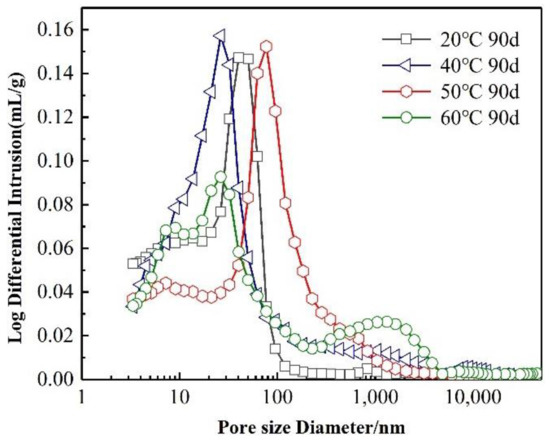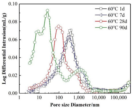 Figure 3 shows the development law of the mortar’s pore structure with age at 60 °C. With the increase in the curing age, the internal porosity of the SRPC gradually decreases. The most probable pore size is approximately 350 nm at 1 d. With the formation of hydration products, some pores are filled, and the most probable pore size decreases to 227 nm, 95 nm, and 32 nm at 7 d, 28 d, and 90 d, respectively. However, the high temperatures had an adverse effect on the development of the pore structure in the later stage of hydration. Although most of the pores in the hardened cement paste were less than 50 nm in diameter after 90 d, there were also some harmful pores whose pore diameters were approximately 1000 nm. The reason for this is that the hydration products were unevenly dispersed due to the accelerated hydration at high temperatures, so the pores in the paste could not be filled completely and the compactness of the paste was reduced [6]. This is also the reason why the growth of the SRPC’s strength was restricted in the later stage.
