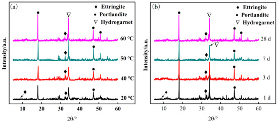 Figure 5 shows the XRD patterns of the SRPC at different temperatures (Figure 5a) and different curing ages (Figure 5b). It can be seen from Figure 5a that, compared with the XRD pattern of OPC [9], high-temperature curing had little effect on the types of hydration products of SRPC. Yan et al. [31] also found that high temperatures hardly affect the formation types of hydration products. However, it can be found from Figure 5 that the diffraction peak of ettringite gradually weakened as the curing temperature increased. In Figure 5b, a weak diffraction peak of ettringite can be observed at 1 day only and, due to the progression of hydration, only Ca(OH)2 and hydrotalcite can be observed at 28 d.