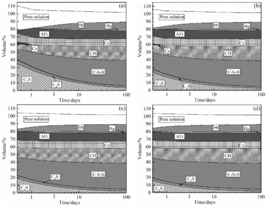 Relationship between hydration products and time: (a) 20 °C; (b) 40 °C; (c) 50 °C; (d) 60 °C. C3S, Tricalcium Silicate; C2S, Dicalcium Silicate; C-S-H, Calcium Silicate Hydrate; CH, Calcium Hydroxide; Cs, Gypsum; Cc, Calcite; AFt, Ettringite; Ht, Hydrotalcite; Hg, Hydrogarnet.