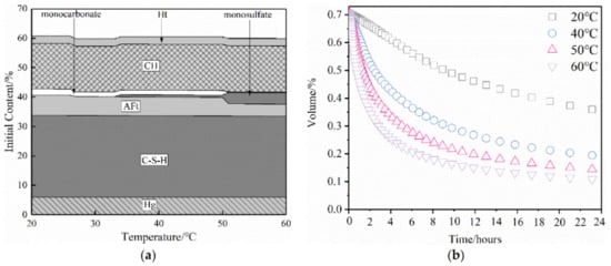 Figure 7 shows the change in the hydration products with the increase in the curing temperature. It can be seen that the main hydration products C-S-H, Ca(OH)2, and hydrotalcite are relatively stable at 60 °C, and hydrogarnet also had no material transformation in this temperature range. However, when the temperature increased to 50 °C, the monocarbonate disappeared, the amount of ettringite decreased (2.23%), and the amount of monosulfate (AFm) increased (3.06%). This was because, at this temperature, ettringite reacts with monocarbonate to form AFm [33]. AFm can be formed at 34 °C, and the amount increases as the temperature increases and the hydration reaction continues. Perkins et al. [34] found that increasing the temperature promoted the formation of AFm and decreased the stability of ettringite. In addition to material transformation, high-temperature dehydration also affects the stability of ettringite [9]. When the temperature exceeds 50 °C, ettringite crystals will lose two molecules of bound water, the crystallinity will decrease [35], and the diffraction intensity will also decrease in the XRD pattern. This is why the diffraction peak of ettringite cannot be observed in Figure 4.