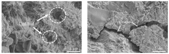 Figure 8 shows the microstructure of the SRPC hydrated for 1 d, 3 d, 7 d, and 28 d at 60 °C. It can be seen that the internal compactness of the hardened cement paste is affected to a certain extent. The hydration products that were formed could not be dispersed due to the influence of the newly formed products before they could be filled into the voids, and hydration products are wrapped around the cement clinker. As a result, the hydration process did not complete, resulting in an uneven distribution of the hydration products in the hardened cement paste.