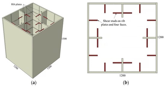 CFST column with rib plate and shear stud connectors: (a) 3D view and (b) top view.