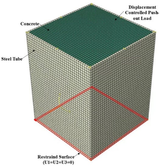 Finite-element models of the mega CFST columns were formulated using ABAQUS version 2017 [14]. The geometric and material nonlinearities were considered in this analysis. Push-out analysis was conducted by restraining the three translational degrees of freedom of the steel tube base and applying a displacement control load at the top surface of the concrete, as shown in Figure 7. Since only the steel tube at the bottom is supported, and the load is applied to the top surface of the concrete, the applied load is transferred from the concrete to the steel tube via bond stress at the steel–concrete interface.