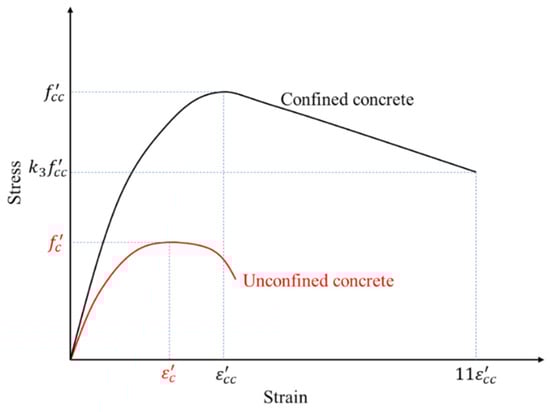 The uniaxial compressive stress–strain relationship of the confined C70 concrete was modeled using the Drucker–Prager hardening rule by utilizing the material constitutive model for confined concrete [15]. The adopted constitutive model is illustrated in Figure 8. The unconfined concrete stress–strain relation along with the compressive strength and the corresponding strain are shown in red. Here, was taken as 0.003 in the analysis based on the ACI 318 [16] recommendation. When concrete is subjected to confining pressure, the compressive strength and the corresponding strain are higher than those of unconfined concrete, as illustrated in Figure 8 [15]. The confined strength and the corresponding strain are related by Equations (1) and (2), respectively [17].