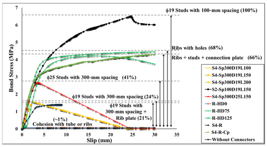 Connecting plates with rib plates and shear studs, as in S4-R-Cp, improved the bond stress performance beyond the proportionality limit with no bond stress degradation up to a 30-mm slip. The maximum bond stress achieved was 66% of that of the S2 model. As shown in Figure 10, the maximum bond stress reached by the S4-R-Cp model is comparable to that of the R models with circular holes. However, S4-R-Cp reached the proportionality limit at bond stress which was 45.3% that of the R-HD125 model.