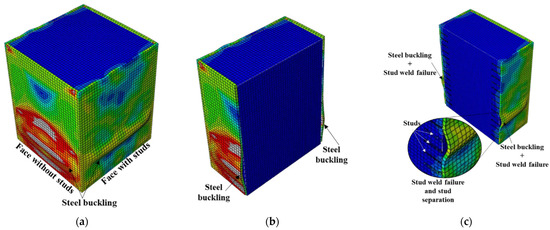 Failure mode of S2-Sp100D19L150 (closely spaced stud on two parallel faces): (a) steel tube buckling, (b) outward buckling of faces without studs, and (c) outward buckling and stud weld failure.