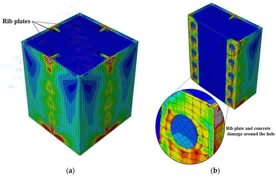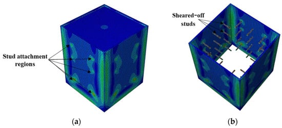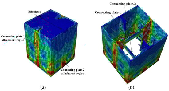 Failure mode of S4-R-Cp (studs, rib plates, and connecting plates): (a) stress distribution and (b) stress distribution on inner face.