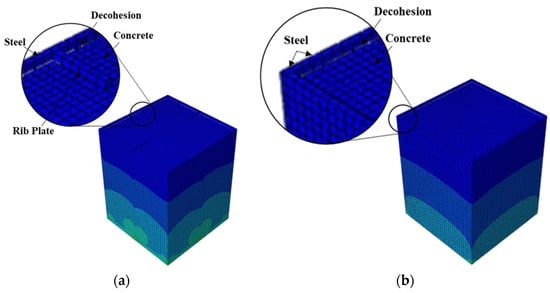 Finally, the R-HD0 model and the model without connectors exhibited the lowest bond stresses, as illustrated in Figure 10. The bond stress in these two models relied on the cohesion between the concrete and steel tube/rib plates. As a result, the bond stress in these models was lost when decohesion occurred, as shown in Figure 16. The addition of rib plates increased the steel–concrete contact area; however, the bond strength improvement was negligible. Table 4 summarizes the key parameters obtained from the analysis and the failure modes.