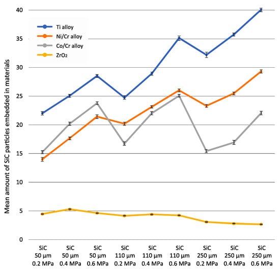The quantity of embedded abrasive particles appears to be dependent on the type of treated material, the gradation of the abrasive particles, and the amount of applied processing pressure. The tested materials were characterized by varying hardness from very soft titanium (96 HV) through slightly harder Ni/Cr alloy (186 HV), harder Cr/Co alloy (403 HV) up to very hard ZrO2 (1412 HV). It should be noted that the hardness of ZrO2 is similar to that of the used abrasives. The greatest amount of embedded abrasive, regardless of the type of abrasive material and processing parameters, was observed on the surfaces of titanium alloy samples, followed by Ni/Cr and Co/Cr alloys, and the lowest for the surfaces of ZrO2 samples. Clearly, harder materials demonstrated lower numbers of embedded grains at the same abrasion parameters. This is mainly related to the ductility of the treated material: materials of low hardness are characterized by high ductility and can hence easily be embedded by the abrasive particles. The area involved by the embedded particles can expand many times. Depending on the used parameters, it ranges from 3–4% for ZrO2, through 13–25% for Cr/Co alloy, 13–30 for Ni/Cr alloy, up to 22–38% for Ti alloy.