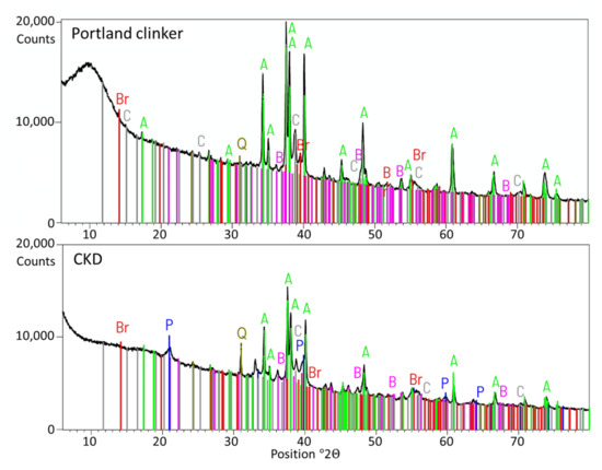 Figure 4. XRD analysis of CKD and the Portland clinker from which production it was obtained. A—tricalcium silicate; B—dicalcium silicate; C—tricalcium aluminate; Br—tetracalcium aluminoferrite; Q—quartz; P—portlandite.