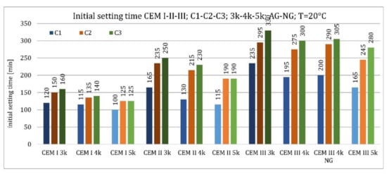 The influence of clinker type on the initial setting time of the unmodified pastes at 20 °C is shown in Figure 6. Cements made from clinker C1, which contained 13.5% C3A, were characterized by the shortest initial setting time. The cements made of the other two clinkers (containing 4.0% and 2.4% C3A) exhibited longer initial setting times. These relationships were true when Portland cement CEM I, Portland slag cement CEM II/B-S, and blast furnace CEM III/A cement were tested at 20 °C, and CEM I cements at 8 °C. More significant relative increases in differences were observed for cement containing GGBFS.