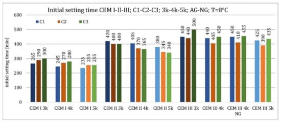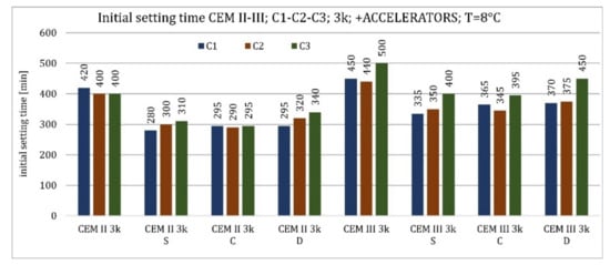 Initial setting time of cements CEM I, CEM II/B-S, CEM III/A modified with accelerators at 8 °C.