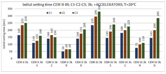 Initial setting time of cements CEM I, CEM II/B-S, CEM III/A modified with accelerators at 20 °C.