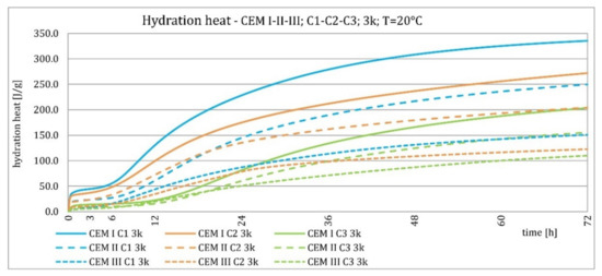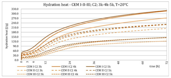 Cements made with C1 clinker were characterized by the highest heat released during the first 72 h and the highest maximum hydration heat released during the post-induction period. Cements containing C2 clinker were second, and those with C3 clinker were third. This observation was independent on the content of ground granulated blast furnace slag. Increasing the specific surface area of the clinker resulted in a shortening of the induction period, an increase in the maximum heat release in the post-induction period, and an increase in the heat released after 72 h, which is confirmed in the literature [2,32]. The higher GGBFS ratio caused greater differences in hydration heat for cements of different specific surface areas. It can be explained by averaging the specific surface area by using slag with the same specific surface area in all cements in increasing amounts. Furthermore, the plot for CEM III/A cement showed a characteristic second maximum occurring in the post-induction period.