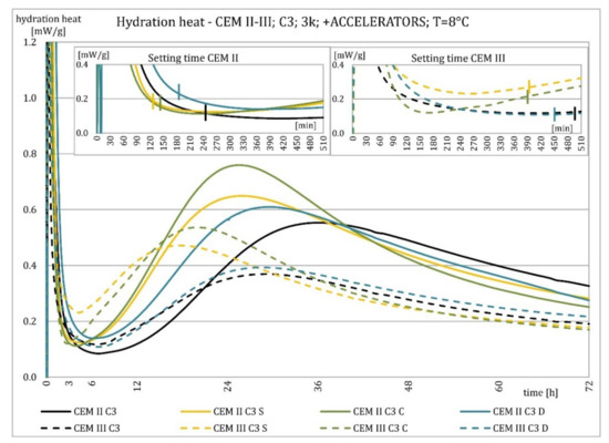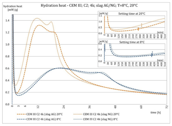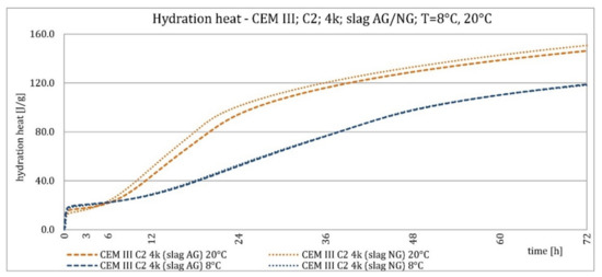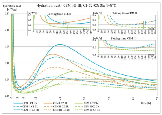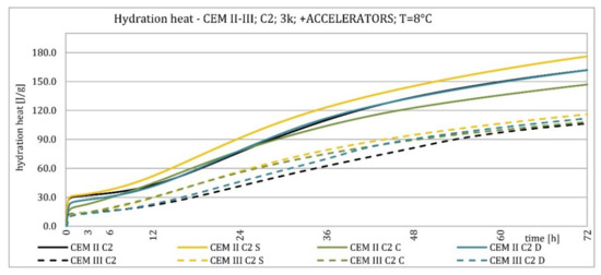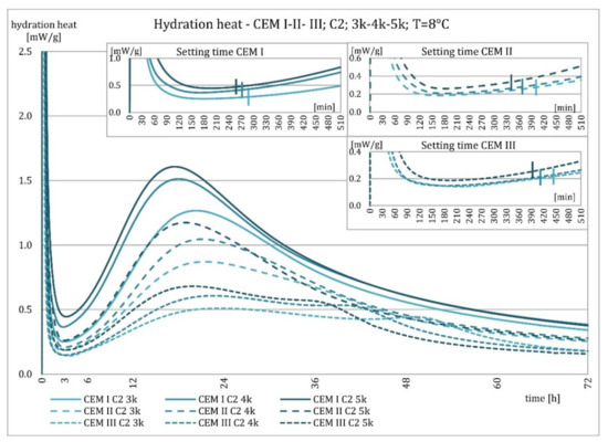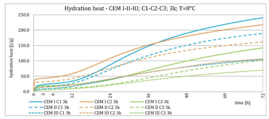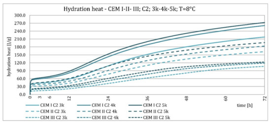 As described earlier, the relationships occurring at an ambient temperature of 20 °C were also valid at 8 °C. Decreasing temperature caused an elongation of the induction period, an elongation of the postinduction period, a decrease in its maximum, and a decrease in the heat of hydration after 72 h. More evident than at higher temperatures was the relative differences in heat release between cements with different specific surface areas after 72 h. For all cements, it could be seen that up to about 36 h, the hydration heat was higher for cements made from C2 clinker compared to C1 clinker, which was much smaller at a higher temperature for cements CEM II/B-S and CEM III/A cements. Later, the relationship reversed.