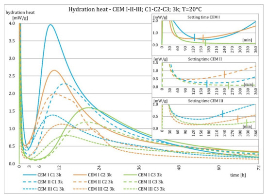 The phase composition of Portland clinker varies according to the feed of the raw materials and methods used in its production. Clinker is a composition of tricalcium silicate (alite—C3S), dicalcium silicate (belite—C2S), tricalcium aluminate (celite—C3A), and tetracalcium aluminate (brownmillerite—C4AF). Phase composition ranges for C3S are: 45–70%, C2S: 10–30%. C3A: 5–12%, C4AF: 5–12% [31,32]. The heat of hydration released by the individual phases is shaped as follows: C3S 500 J/g, C2S 260 J/g C3A 870 J/g, C4AF 420 J/g [2]. C3S has the greatest share in shaping the heat evolution of hydration due to its high heat release rate and its highest content, and C3A due to its highest heat release rate. In the initial hydration stage, C3A has the greatest influence due to the fastest reaction [32,33]. There are few comprehensive comparisons of the hydration heat and setting time with different phase compositions. Single test results are reported for specific cements. Cement containing more C3A achieved the highest amount of heat of hydration released. The highest heat release does not always coincide with the fastest initial setting time [34].