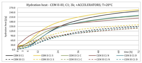 The results of the hydration heat tests for accelerator-modified cements are presented in Figure 20, Figure 21, Figure 22, Figure 23, Figure 24, Figure 25, Figure 26, Figure 27, Figure 28, Figure 29, Figure 30 and Figure 31 for CEM II/B-S and CEM III/A, separately for cements containing different Portland clinkers. In the case of cements modified with admixture containing nucleation seeds (yellow curves), the induction period was shortened, the maximum hydration heat evolved in the post-induction period increased and occurred earlier, and the amount of hydration heat evolved after 72 h was increased. The accelerator was slightly more effective in CEM III/A than in CEM II/B-S and cement made from clinkers containing less C3A (C2 and C3).