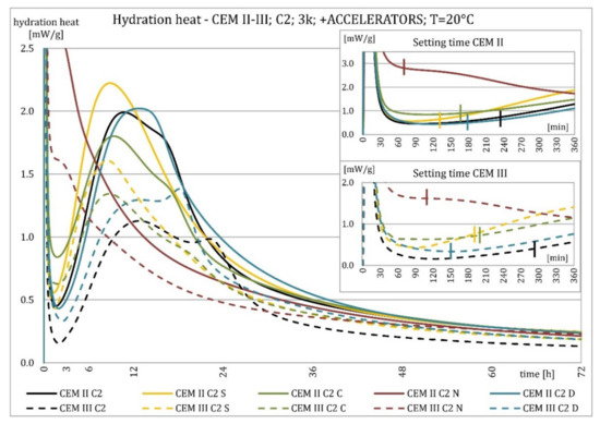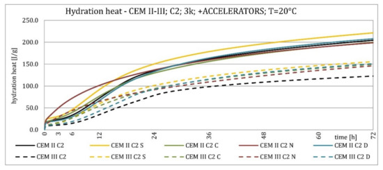 Hydration heat of C2 clinker-based cements CEM II/B-S, CEM III/A modified with accelerators at 20 °C.