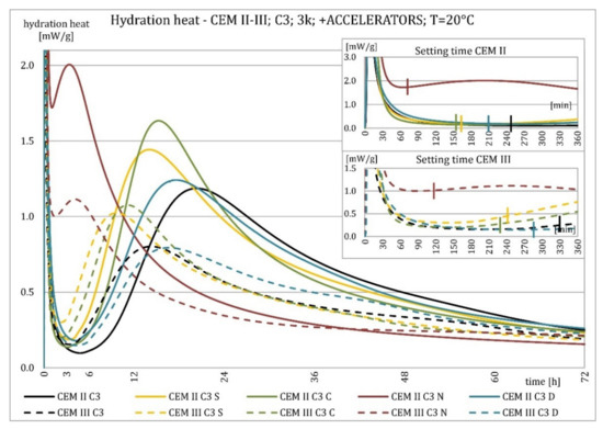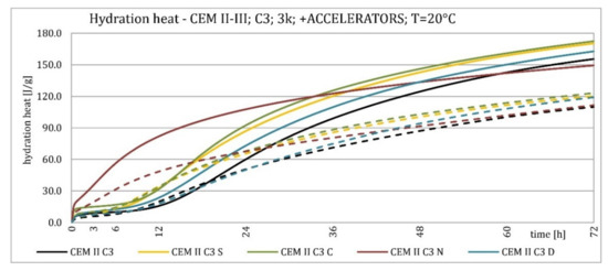 Hydration heat of C3 clinker-based cements CEM II/B-S, CEM III/A modified with accelerators at 20 °C.