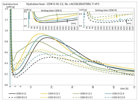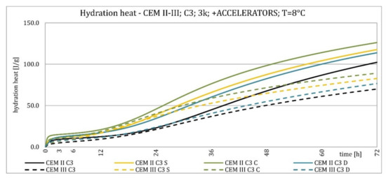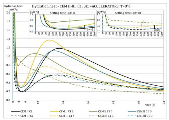 To accelerate cement setting, in most cases, additional clinker grinding, which is a very energy-intensive process [75], can be successfully replaced by the use of setting accelerators. Accelerators were not sufficient to compensate for the temperature difference.