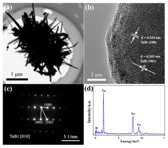 - Wei, T.T.; Liu, Z.T.; Ren, D.L.; Deng, X.G.; Deng, Q.H.; Huang, Q.; Ran, S.L. Low temperature synthesis of TaB2 nanorods by molten-salt assisted borothermal reduction. J. Am. Ceram. Soc. 2018, 101, 45–49. [Google Scholar] [CrossRef]