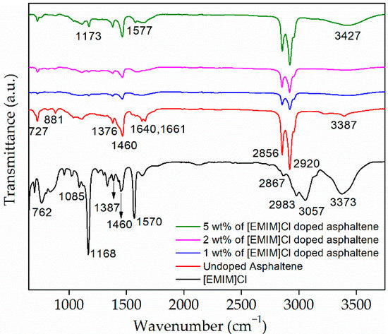Asphaltene molecular structure is commonly attached with functional groups. These functional groups were identified by using ATR-FTIR. Figure 3 shows FTIR spectra of asphaltene doped with 1, 2, and 5 wt% of [EMIM]Cl, respectively. As a comparison, spectra for undoped asphaltene and [EMIM]Cl are also included. There are a few peaks of interest that are visible in all asphaltene spectra. Particularly, we focus on the peaks at 2920 cm−1, 2856 cm−1, 1376 cm−1, 1460 cm−1, which were ascribed to C-H symmetric stretching, C-H asymmetric stretching, C-H symmetric bending, and C-H asymmetric bending, respectively.