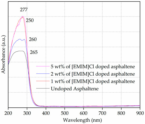 The optical properties of the undoped and [EMIM]Cl-doped asphaltene were investigated in solid-state form. The absorption spectra of the thin films are shown in Figure 5. The absorbance intensity in the UV range (200 nm–320 nm) indicates the presence of aromatic groups in the undoped and [EMIM]Cl-doped asphaltene film [35]. The profile of the undoped asphaltene film was rather broad compared to the [EMIM]Cl-doped thin films. The absorption spectra of undoped and 2 wt% of [EMIM]Cl-doped asphaltene film exhibited maximum wavelength (λmax) at 265 nm and 260 nm, respectively. Whereas, for the 1 and 5 wt% of [EMIM]Cl-doped asphaltene film, the λmax was at 275 nm. For 5 wt% of [EMIM]Cl, an additional hump was observed at 250 nm.
