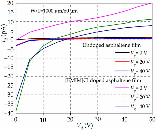 The most glaring feature of Figure 6 is that Id is small (in the range of a few tens pA). This is expected because the structure of the OFET has not been fully optimized, i.e., high-contact resistance, thick dielectric material, and high surface charge density. The next observation is that the Id flows even at Vg = 0 V. This is typical for an OFET operated in depletion mode. It is also observed that for [EMIM]Cl-doped asphaltene OFET, the Id switches from negative to positive current at crossover voltage, Vd ~15 V and Vd ~20 V for Vg = 20 and 40 V, respectively. The negative current can be ascribed to the current arising from the tunneling of carriers from the source to the gate contact. This is feasible considering that the electric field across the oxide is much greater than 106 V/cm [43]. The Id becomes positive when the effective tunneling electric field has been reduced by the opposing electric field arising from the increase of the Vd. More importantly, it is also observed that the Id for the [EMIM]Cl-doped OFET is two orders of magnitude higher than the Id from the undoped OFETs. The increase in Id is believed to be due to an increase in the number of charge carriers in the channel originating from the IL doping.