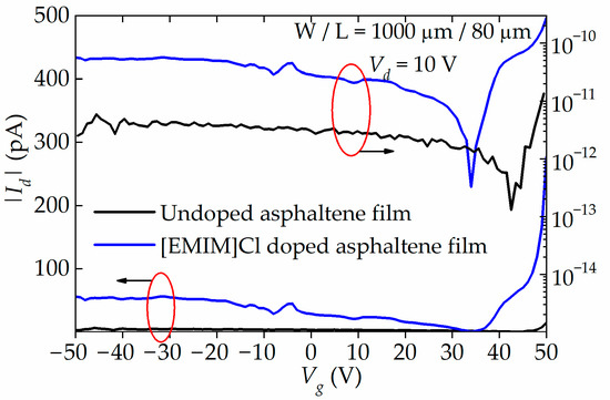 Field-effect transistor characteristics of the undoped and [EMIM]Cl-doped asphaltene OFET.