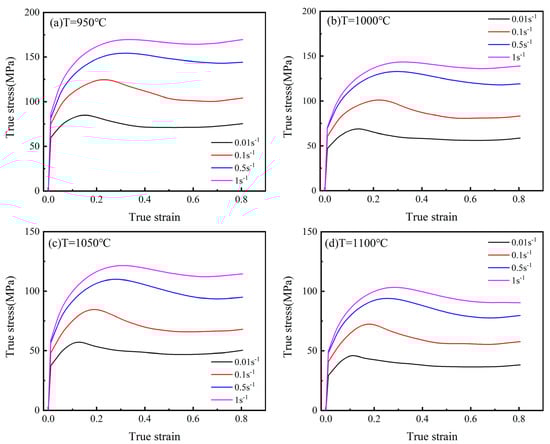 The flow curves of the 25CrMo4 steel at deformation temperatures of 950–1100 °C and strain rates of 0.01–1.0 s−1 are presented in Figure 2. In the early stage of deformation, the flow stress increases rapidly with increasing strain, which is mainly due to the work hardening (WH) caused by the generation and proliferation of dislocations [32], and the growth rate of the stress becomes smaller due to dynamic recovery (DRV). When the stress reaches its peak, dynamic recrystallization (DRX) occurs, consuming a large number of dislocations, so the flow stress gradually decreases. However, the hot deformation behavior at 950–1000 °C with a strain rate of 1 s−1 shows a trend of WH, which may be due to the incomplete recrystallization phenomenon resulting in the insufficient recovery of WH at lower temperatures and higher rates [33]. It is noteworthy that as the strain rate increases and the temperature decreases, the peak stress and critical strain gradually increase.