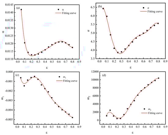 Since the constitutive model does not account for the effect of strain on the parameters, polynomial fitting methods are considered to describe the relationships between the material parameters and strain. The relationships between , , , and can be fitted by strain: