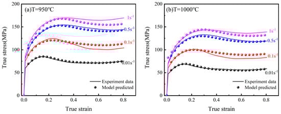 The comparison of the experimental and the Arrhenius model predicted data is shown in Figure 11. When the strain rate is 0.01 s−1, the curves fit well at 950 °C and 1000 °C, with smaller deviations occurring at 1050 °C and 1100 °C. When the strain rate is 1 s−1, the curve fits well at 1100 °C and deviates more and more from the experimental data as the temperature decreases. This may be due to the fact that the model does not consider the coupling effect of temperature and strain rate, resulting in a large deviation between the predicted and experimental data under certain conditions. The experimental and the modified Arrhenius model predicted data are compared in Figure 12. It is clear that the modified Arrhenius model can accurately predict the hot compression deformation behavior of the 25CrMo4 steel.