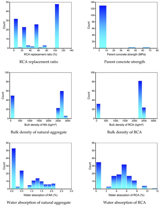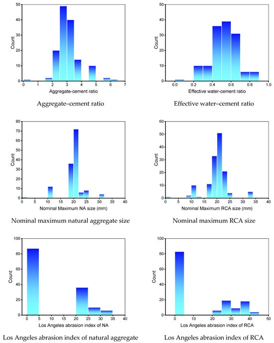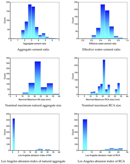 Relative frequency dispersal of input parameters for the compressive strength dataset. NA: natural aggregate, RCA: recycled concrete aggregate.