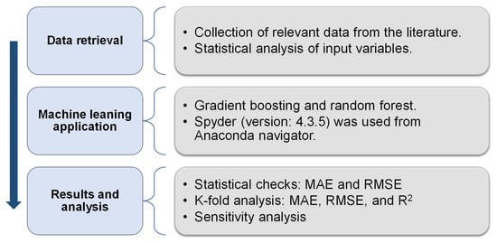 Two ensemble machine learning methods (gradient boosting and random forest) were used to accomplish the objectives of this research, using Python code and the Anaconda Navigator program. Spyder 4.3.5 was used to execute the gradient boosting and random forest methods. Typically, these machine learning methods are used to anticipate desired outputs based on input factors. These methods are capable of forecasting the temperature effects, the strength properties, and the durability of materials [40,41]. Ensemble machine learning methods commonly exploit the weak learner by constructing 20 submodels that may be trained on data and modified to maximize the R2 value. The strategies to choose optimal hyperparameters include splitting the data for training and testing models (80% for training and 20% for testing), selecting the optimal submodel based on R2, and the k-fold analysis method. R2 represents the performance/validity of machine learning approaches. The R2 statistic is used to determine the amount of variance in a response variable provided by a model. In other words, it expresses the model’s fit to the data quantitatively. A number around zero implies that fitting the mean is comparable to fitting the model, but a value near one shows that the data and model are nearly completely matched [42]. The subsections below discuss the machine learning techniques employed in this study. Moreover, all machine learning methods are validated using k-fold assessment, statistical checks, and error measures (root-mean-square error (RMSE) and mean absolute error (MAE)). Furthermore, sensitivity analysis is performed to determine the effect of each input variable on the predicted findings. The flow diagram in Figure 3 illustrates the research method used in this study.