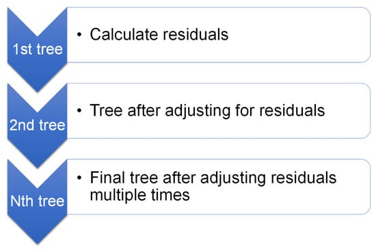 Friedman [43] presented gradient boosting as an ensemble strategy for classification and regression in 1999. Gradient boosting is only applicable to regression. As seen in Figure 4, the gradient boosting technique compares each iteration of the randomly chosen training set to the base model. A weak predictor is constructed using all of the training data. Then, the training data are predicted using a weak predictor. With the expected outcome, it is simple to calculate the residuals for each training instance. Gradient boosting for execution may be sped up and accuracy increased by randomly subsampling the training data, which also helps to prevent overfitting. The lower the training data percentage, the faster the regression, because the model must suit minor data every single iteration. Gradient boosting algorithms require tuning parameters, including n-trees and shrinkage rate, where n-trees is the number of trees to be generated; n-trees must not be kept too low, while the shrinkage factor—normally referred to as the learning rate employed to all trees in the development—should not be set too high [44].