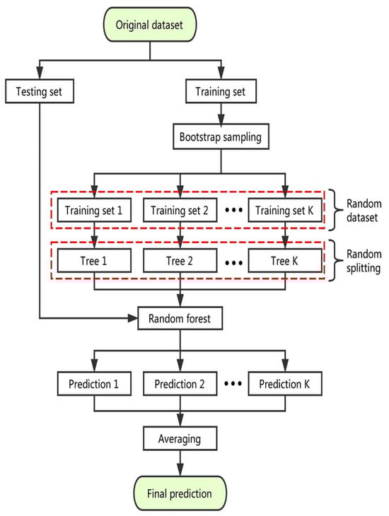 Random forest are deployed by bagging decision trees using the random split choice technique [45]. The modeling procedure for the random forest approach is illustrated schematically in Figure 5. Each tree in the forest is generated by means of an arbitrarily selected training set, and each split inside a tree is constructed by means of an arbitrarily chosen subgroup of input factors, yielding a forest of trees [46]. This element of instability adds variation to the tree. The forest as a whole is composed completely of mature binary trees. The random forest technique has established itself as a highly effective tool for general-purpose classification and regression. When the number of variables surpasses the number of observations, the technique has proven improved precision by aggregating the predictions of several randomized decision trees. Additionally, it is adaptable to both large-scale and ad hoc learning tasks, yielding measures of varying degrees of importance [47].
