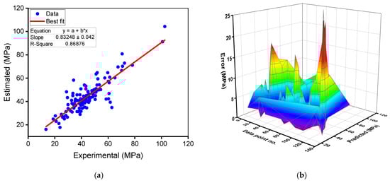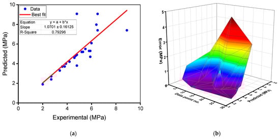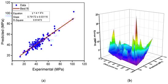 Random forest model for compressive strength: (a) relationship between experimental and predicted results; (b) spreading of predicted and error values.