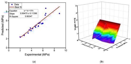 The experimental and anticipated outcomes of the random forest model for the flexural strength of RAC are shown in Figure 9. Figure 9a represents the relationships between experimental and projected outcomes, with an R2 of 0.86 indicating that the random forest model for the flexural strength is less specific than the compressive strength prediction of RAC. This reduced R2 is because there are fewer data points used to forecast the flexural strength than the compressive strength. Figure 9b indicates the distribution of estimated and error values for the random forest flexural strength model. The discrepancy between experimental and estimated values ranged from 0.02 to 2.24 MPa (34.46 variances), with an average of 0.56 MPa (10.43% variance). Moreover, for 23 mixes, the variation from the experimental outcomes was less than 1 MPa, whereas it was greater than 1 MPa for only 5 mixes. These values indicate a lower difference between the random forest model’s predicted and experimental results. As a result, the random forest technique is more accurate in forecasting RAC’s flexural strength than the gradient boosting model.