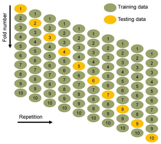 The machine learning methods were validated by employing k-fold and statistical methods. The k-fold technique, in which related data are randomly spread and separated into 10 groups, is widely used to determine a technique’s validity [48]. Nine groups are employed for training the model, and one group is used for validation, as shown in Figure 10. The model is more accurate when the errors (MAE and RMSE) are less and the R2 is high. In order to get a reasonable conclusion, the operation should be repeated 10 times. The model’s outstanding accuracy is due in large part to this enormous effort. In addition, both models were statistically tested based on errors (MAE and RMSE), as shown in Table 3. In comparison to the gradient boosting technique, this assessment also validated the random forest model’s superior accuracy due to reduced error readings. Equations (1) and (2), which were obtained from prior investigations [31,49], were used to determine the approaches’ prediction performance statistically.
