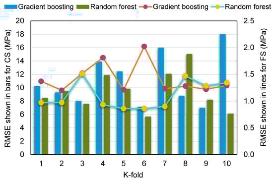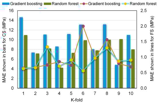MAE, RMSE, and R2 were measured to see how well the k-fold analysis was executed, and the results are shown in Table 4. Figure 11, Figure 12 and Figure 13 show a comparison of k-fold analysis for all of the machine learning techniques used. The MAE values for the gradient boosting compressive strength model ranged from 4.78 to 14.60 MPa, with an average of 10.27 MPa. In contrast, the MAE values for the random forest compressive strength model ranged from 4.19 to 10.92 MPa, with an average of 8.34 MPa. Likewise, the gradient boosting and random forest models for the compressive strength of RAC had average RMSE values of 11.05 and 9.41 MPa, respectively. When R2 values were evaluated, the average R2 values for the gradient boosting and random forest models were 0.67 and 0.72, respectively. When compared to the gradient boosting model, the random forest model—with smaller error values and greater R2 values—was more precise in projecting the compressive strength of RAC. A similar distribution of error and R2 values was discovered for the flexural strength of RAC for both the gradient boosting and random forest models, and this also validated the higher precision of the random forest model. Hence, the random forest model might be employed for the strength estimation of RAC in order to reduce the number of trials required for experimentation.