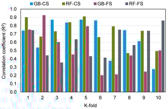 Correlation coefficient (R2) distribution from the k-fold analysis. GB: gradient boosting, RF: random forest, CS: compressive strength, FS: flexural strength.