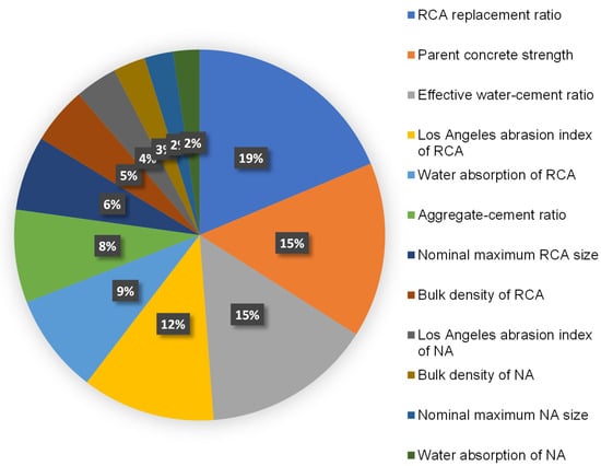 The purpose of this evaluation was to discover the impact of input factors on RAC’s compressive and flexural strength prediction. The anticipated result is considerably influenced by the input factors [51]. Figure 14 shows the influence of the input factors used in this research on the compressive strength evaluation of RAC. The analysis revealed that the RCA replacement ratio was the crucial element, accounting for 18.7% of the overall impact, followed by parent concrete strength at 15.3% and weff/c at 14.8%. The contribution of the other input factors to the strength estimation of RAC was found to be lower, with the Los Angeles abrasion index of RCA, water absorption of RCA, a/c, nominal maximum RCA size, bulk density of RCA, Los Angeles abrasion index of natural aggregate, bulk density of the natural aggregate, nominal maximum natural aggregate size, and water absorption of the natural aggregate accounting for 11.6%, 8.7%, 8.1%, 6.5%, 5.0%, 3.7%, 2.8%, 2.5%, and 2.3%, respectively. Sensitivity analysis produced results associated with the quantity of input variables and the dataset used to build the machine learning models. The impact of an input factor on the method’s results was found using Equations (3) and (4).
