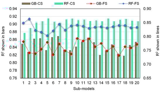Figure 16 depicts the R2 value dispersion for the gradient boosting and random forest submodels. For gradient boosting compressive strength submodels, the lowest, average, and maximum R2 values were 0.818, 0.844, and 0.869, respectively. Additionally, the least, average, and highest R2 values for the gradient boosting flexural strength submodels were noted to be 0.731, 0.762, and 0.793, respectively. Similarly, for random forest compressive strength submodels, the lowest, average, and highest R2 values were 0.877, 0.907, and 0.915, respectively. Meanwhile, the least, average, and greatest R2 values for the random forest flexural strength submodels were identified to be 0.803, 0.834, and 0.863, respectively. These findings revealed that the random forest submodels had greater R2 values than the gradient boosting submodels, indicating that the random forest model was more precise in estimating RAC’s strength. A sensitivity analysis was also conducted to determine the effects of all inputs on the projected strength of RAC. The size of the dataset and the input parameters may have an impact on the model’s performance. The sensitivity analysis determined the contributions of each of the 12 input parameters to the expected output. The three most important input factors were discovered to be the RCA replacement ratio, parent concrete strength, and weff/c.
