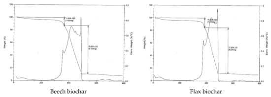 Thermogravimetric analysis of beech and flax biochars before and after modification.