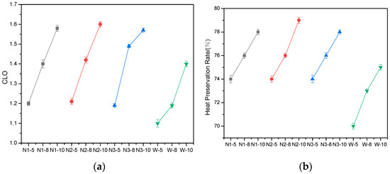 The thermal performance is the most valuable property of down waddings. Three parameters of thermal performance were acquired through thermal measurement, which are the CLO value, heat preservation rate, and heat transfer coefficient, where the CLO value is an engineering unit that describes the thermal insulation properties of fabrics. When the room temperature is 20 °C, the relative humidity does not exceed 50%, the air velocity does not exceed 10 cm/s, and the thermal insulation value or CLO of the clothing worn by a person sitting still or engaging in light mental work to maintain a comfortable state is 1, which is measured by legal measures. The unit is defined as l CLO = 4.30 × 10 K·m·h/J = 155 m·K/W. The results are shown in Figure 4.