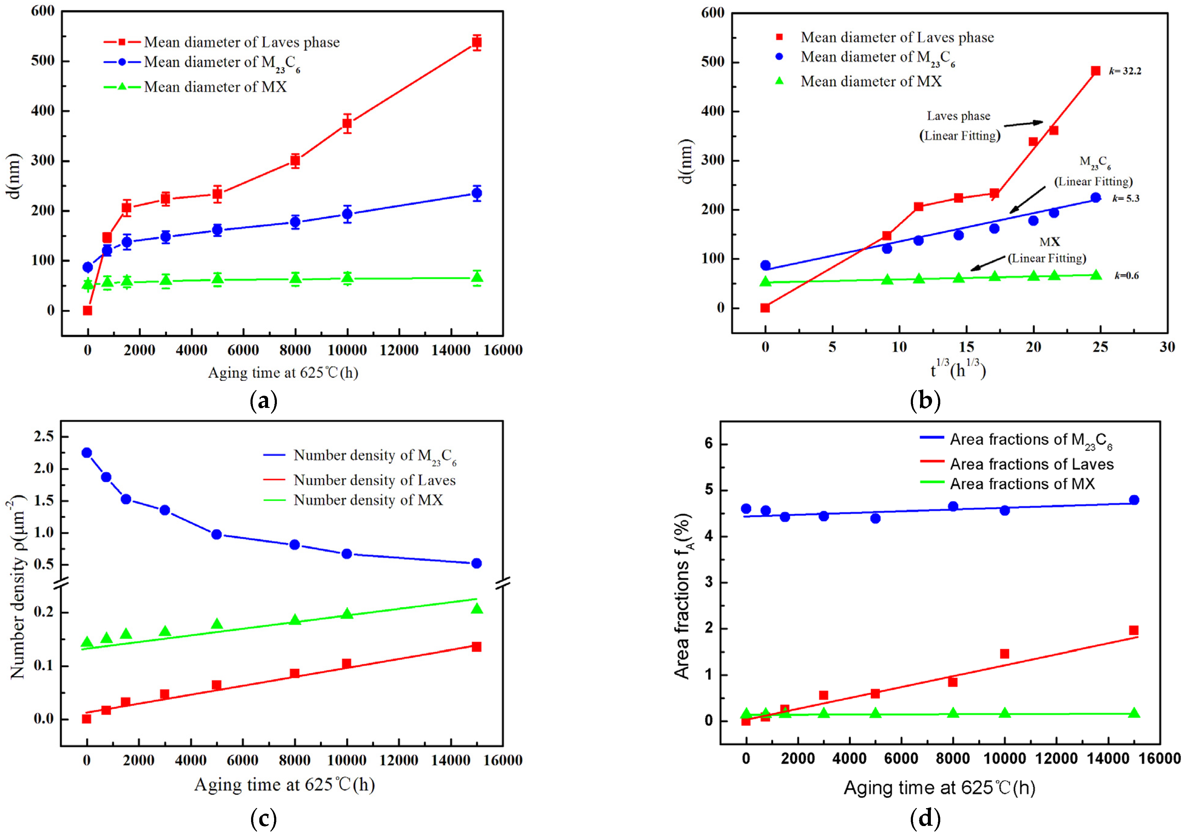 3.2. The Coarsening Behaviors of Laves Phase, M23C6 and MX