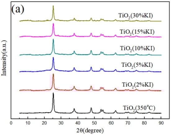 Figure 1a shows the XRD diagram of potassium-iodide-doped TiO2 with different molar ratios and undoped TiO2. The calcination temperature of all samples was 350 °C and the calcination time was 5 h. The diffraction angles corresponding to the diffraction peaks in Figure 1 were compared with the standard diffraction card (JCPDS No.21-1272). It was found that the sample was calcined at 350 °C for 5 h to produce a single crystal of anatase-type TiO2. There was no rutile-type or plate-type TiO2 in the sample. The diffraction angles (2θ) of 25.21°, 37.82°, 47.9° and 62.56° belonged to the crystal planes of (101), (004), (200) and (204) of the anatase type, respectively [27]. It was determined that the prepared TiO2 was a single anatase-type TiO2 crystal. As shown in Figure 1a, with the increase in KI content, the diffraction peak of 25.21° became wider and less sharp. Doping with I ions led to the lattice distortion of TiO2, which weakened the lattice signal and reduced the intensity of the diffraction peak. The XRD test did not detect the related diffraction peak of the iodine compound, indicating that I ions were highly dispersed in TiO2.